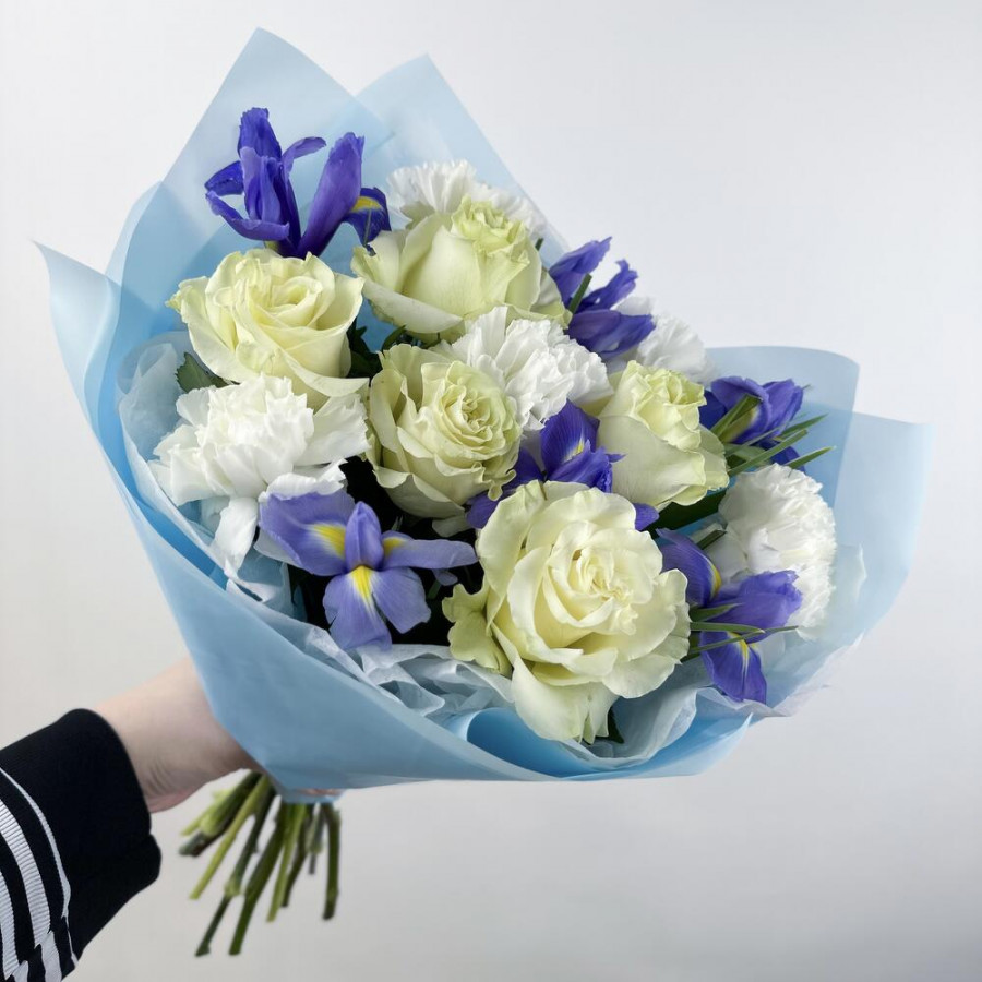 На фото букет из белых гвоздик, синих ирисов и белых роз. В составе: ирис 5 шт, роза 5 шт, гвоздика 6 шт, дизайнерская упаковка 1 шт, атласная лента 1 шт, . Все цветы свежие и ароматные, букет красиво оформлен и отлично подходит для подарка. Доступна доставка цветов или самовывоз.