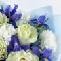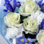 Букет из белых гвоздик, синих ирисов и белых роз в Коряжме